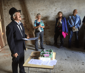 Vandringen fortsatte så videre mot låven på Øvre Hostvedt, der vi ble mottatt av Halvdan Solberg , utkledd i tidsriktig antrekk fra tidlig 1900-tallet.