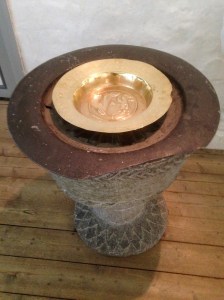 Vi ble vel tatt imot av kirketjener Bent Ove Weberg, og deretter ønsket Gert Olav Green fra Hof kommune de frammøtte velkommen til omvisning i Sande kirke med påfølgende konsert ved koret «De Damene». Han ga deretter ordet til kveldens omviser, Sissel Skeide fra kirkekontoret i Sande. Hun ga oss en grundig innføring i middelalderkirkens historie, fra den ble reist av bøndene i Sande i perioden 1066-1093 og fram til vår tid. Plasseringen av kirken er spesiell. Opprinnelig var kirken planlagt reist på Åshaugen, nord for Sande sentrum, men historien forteller at materialene en natt ble flyttet av de underjordiske Veierud- og Åstussene til stedet der kirken senere ble reist. Kirkebygget av stein er bygget i eldre romansk stil og er en langkirke på 30 meter. I begynnelsen var det ikke noe tårn på kirken, det var jordgulv og svært få vinduer. Først i 1631 ble det bygget tårn på kirken. Tårnet var plassert midt på kirkebygget med fire tårn rundt. Av kirkens inventar ble spesielt døpefonten nevnt. Den er